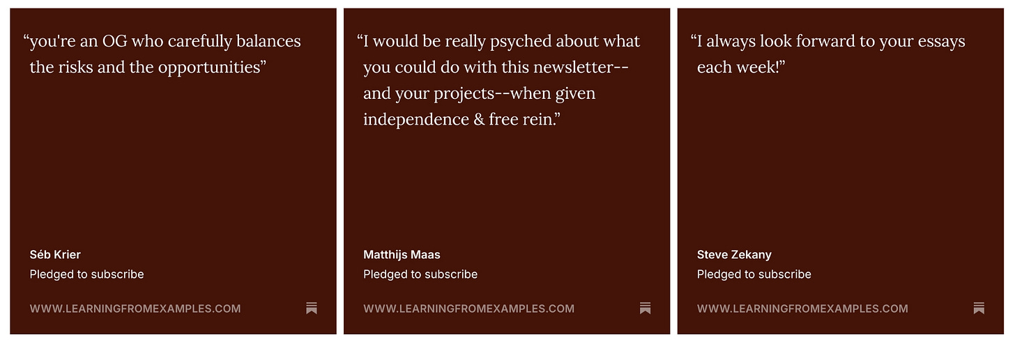 Finally, some kind words from people who have pledged to support Learning From Examples so far. I’m hopeful that there’s a path to making this newsletter my full-time work in the future. Pledges are a small but important step in that direction, and your support means a huge amount to me as I work towards writing more on Substack.